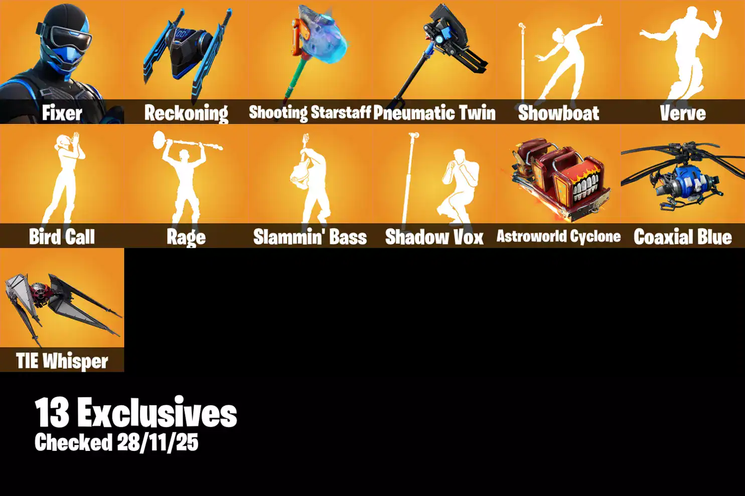 ![[PC/XBOX] 297 Skins | Fixer | Reckoning | Shooting Starstaff | Pneumatic Twin | Showboat | Verve | Bird Call | Rage | Slammin' Bass | 1150 VB](https://99accs.net/wp-content/uploads/2025/11/266-Pickaxes-1.webp)
